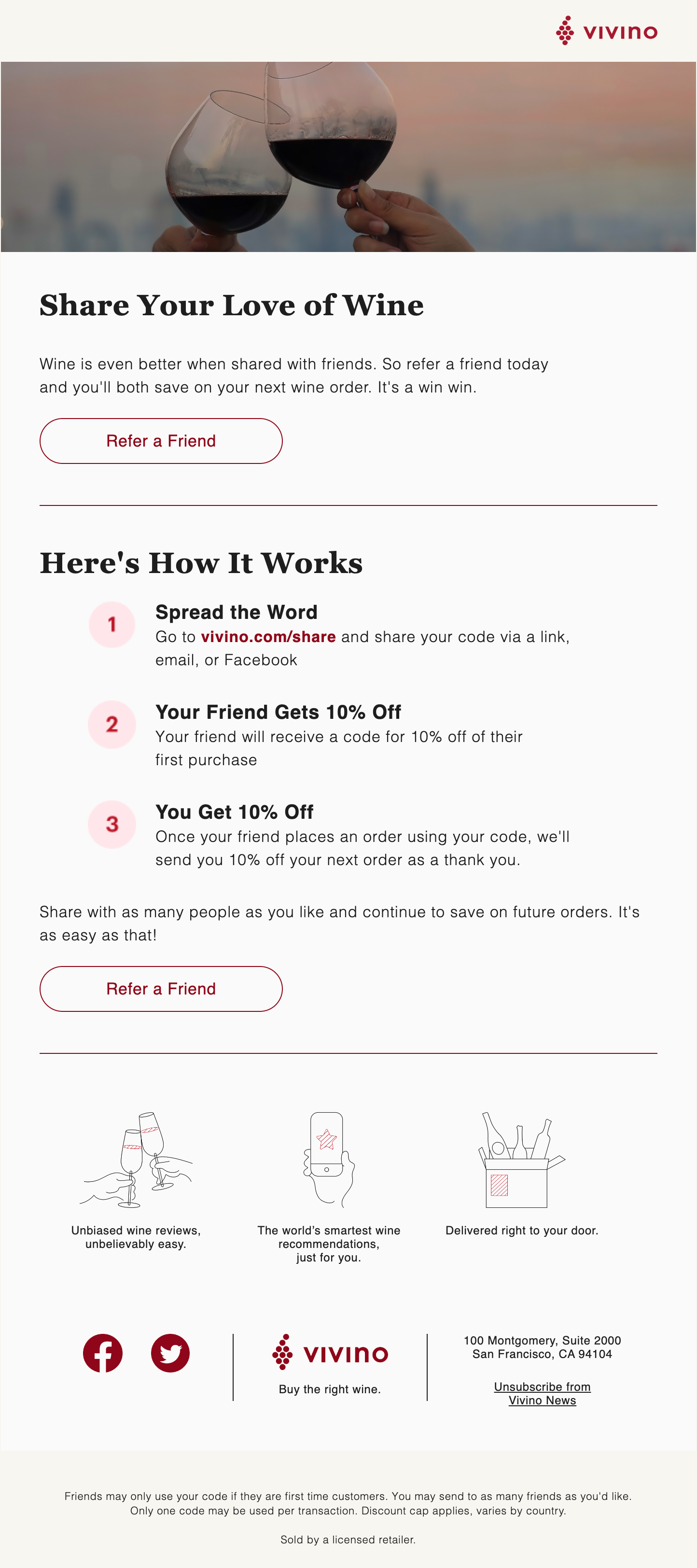 The program incentivizes users to refer the Vivino app to their friends. It is sent to repeat buyers who have purchased a bottle of wine in the past two weeks.