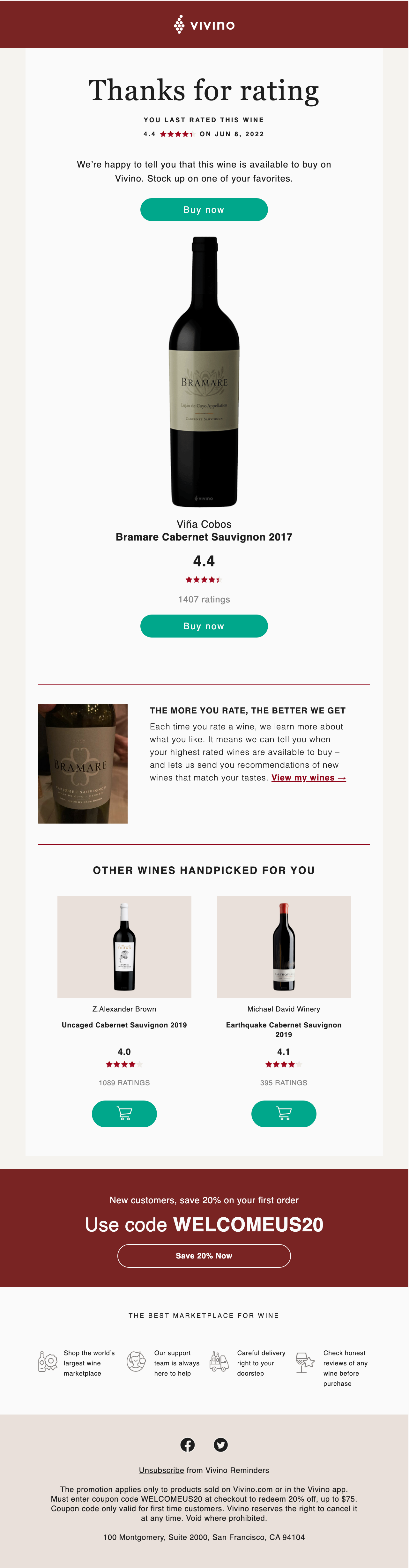 The email and push notification encourages users to buy a wine that they have rated at least 4 stars and if they have not bought it off Vivino in the past 30 days.
